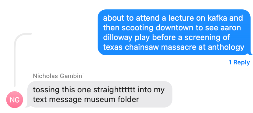I don’t know if it was the election, my burgeoning early-onset midlife crisis, or the fact that my boyfriend and I started the year in a cursed apartment haunted by demons, but from January on I was determined to be out in the world. March was particularly stacked. I went to a talk at the Panorama of the City of New York, I saw Colin’s first show as Coolant at Cassette [Colin note: it was actually just my EP release show, but I do not want to insert myself too much in Leah’s memory], and there was a bunch of book stuff to attend. One Wednesday, I saw Ron Padgett read at the Poetry Project, got my grandmother’s copy of An Anthology of New York Poets signed, and went for beers at Tile Bar afterward with a bookseller I know and his young poet friend. Just two days later, I met my parents at Björk Cafe before heading to the Morgan for the Kafka exhibit, and to attend Michelle Woods’ lecture in Gilder Lehrman Hall. The lecture was on Milena Jesenká and Willa Muir, the women who first translated Kafka into Czech and English, respectively. There were slides like, “Language and Belonging” and “Language, War & Patriarchy.” I had to truly tear myself away in order to make it downtown to Anthology on time for the very special Tone Glow event: a 35mm screening of The Texas Chainsaw Massacre for the occasion of its soundtrack’s Waxwork release, preceded by an Aaron Dilloway set.